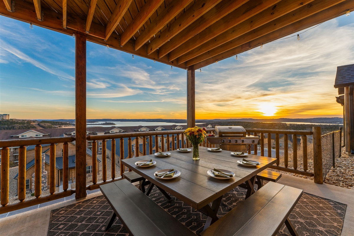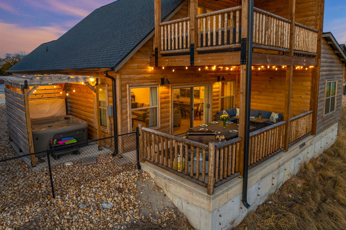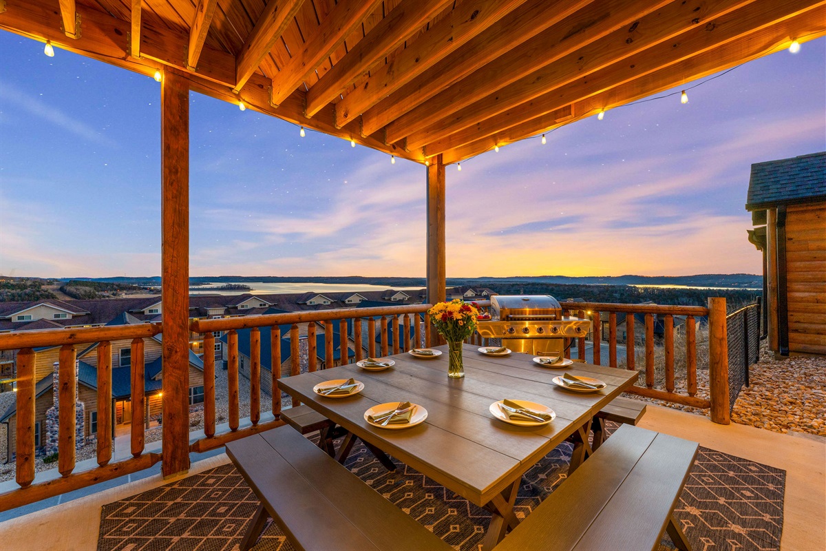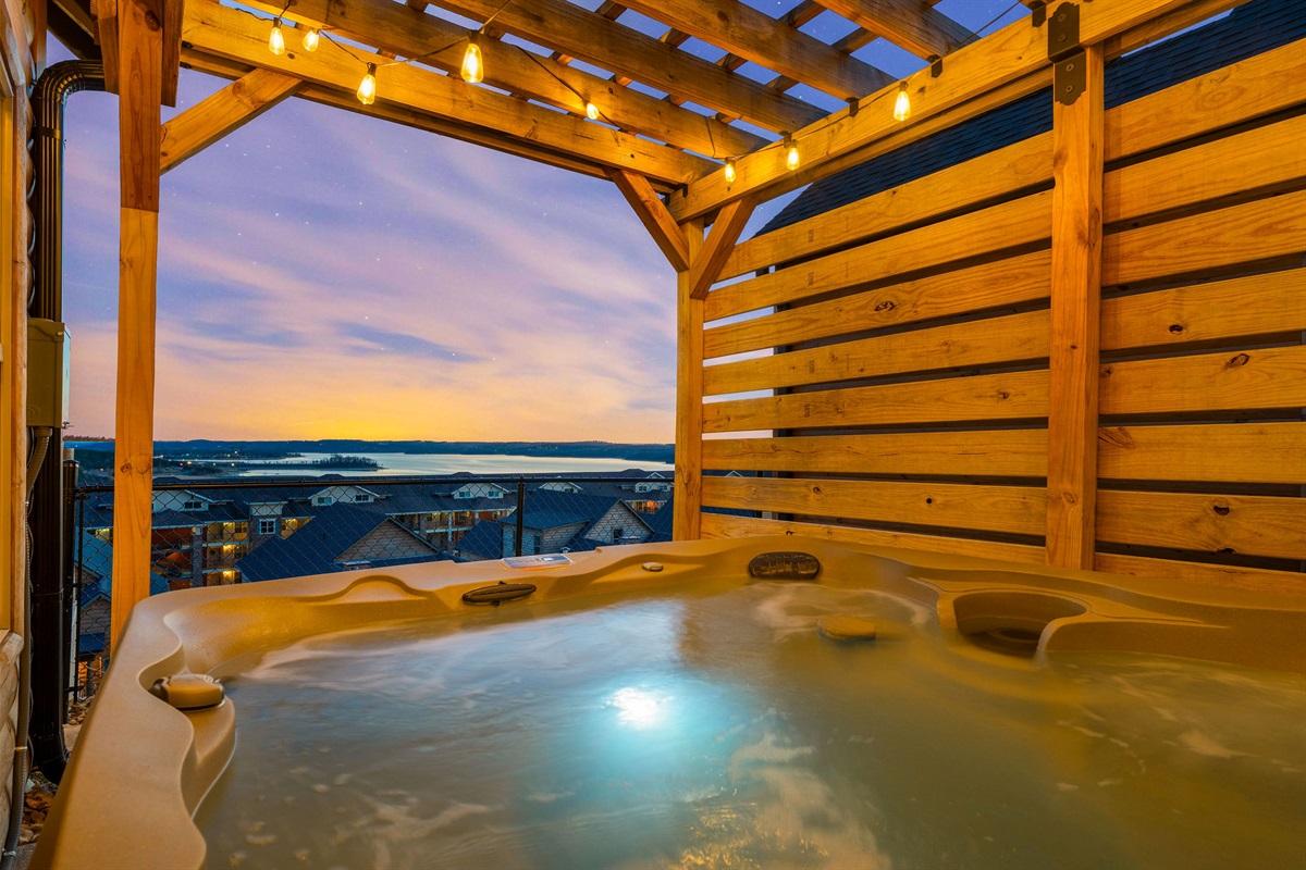 • Patio, Dining Table, Sectional Seating, BBQ Grill, Pergola over Private Hot Tub with Lighting and Lake View