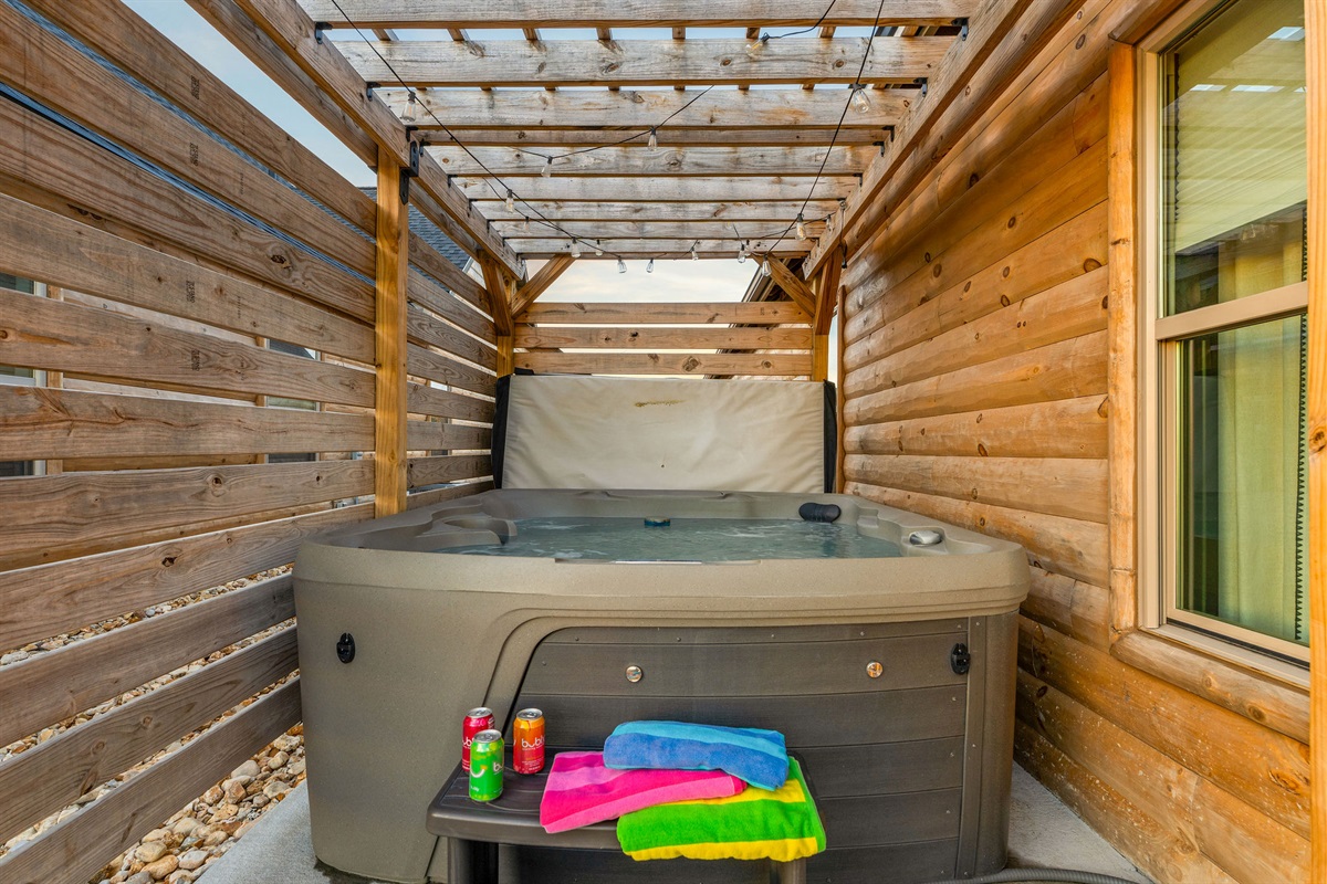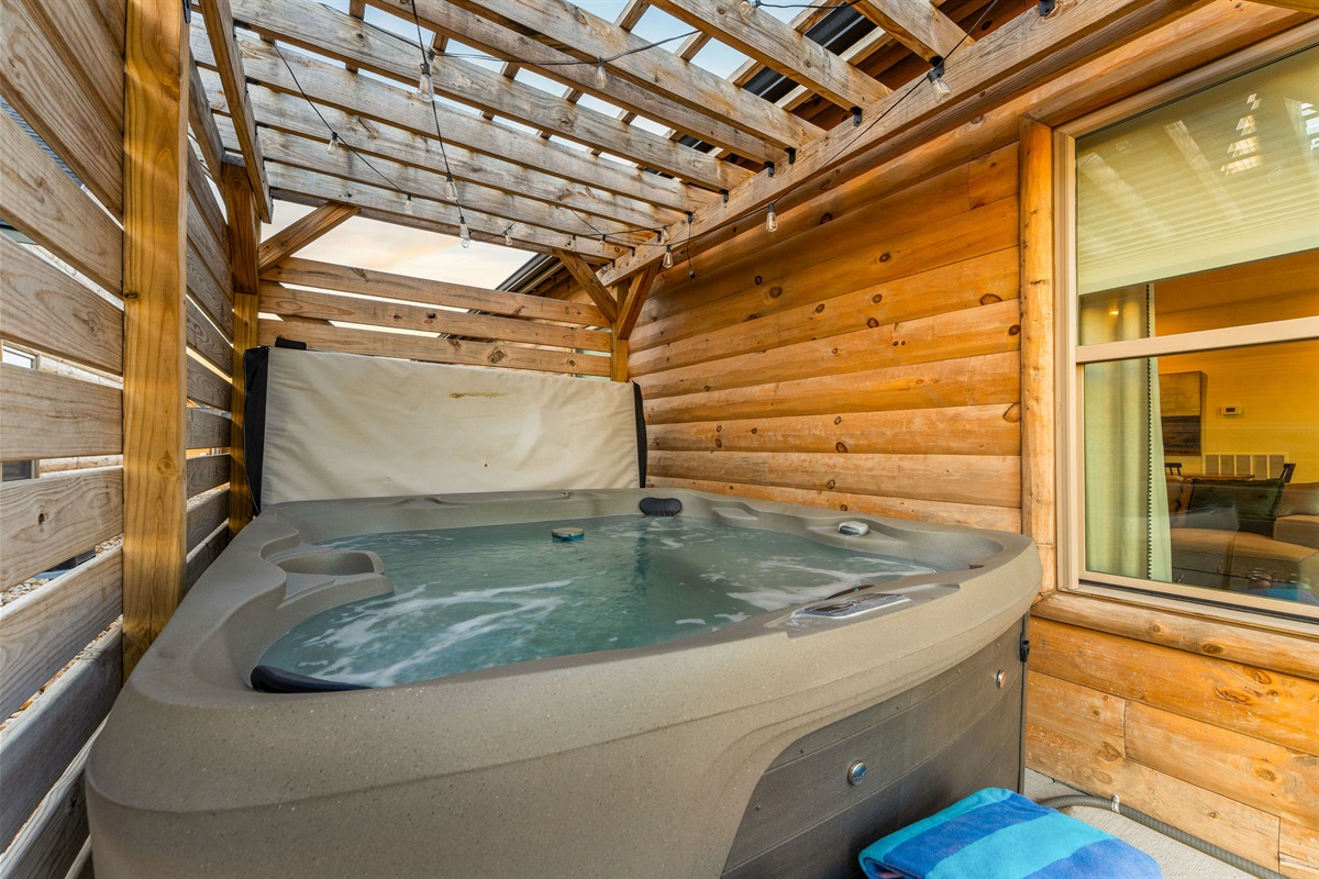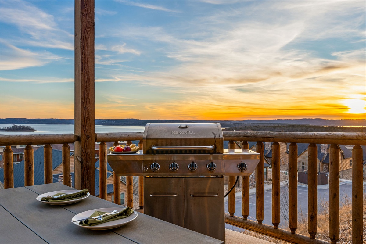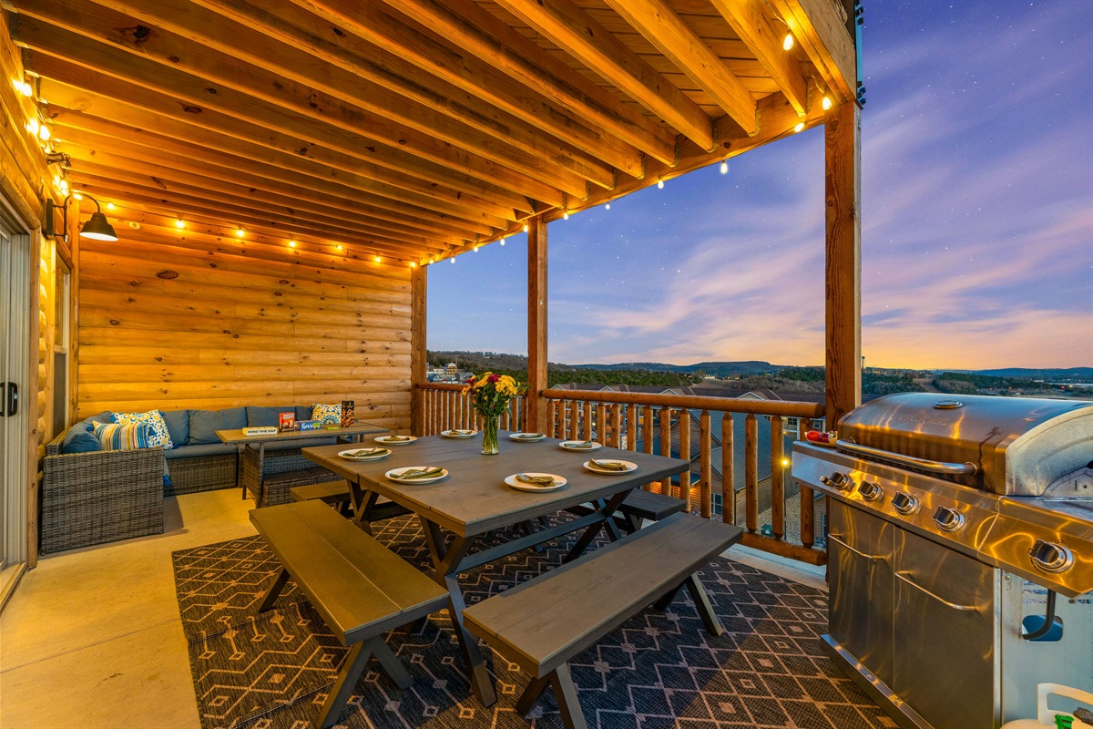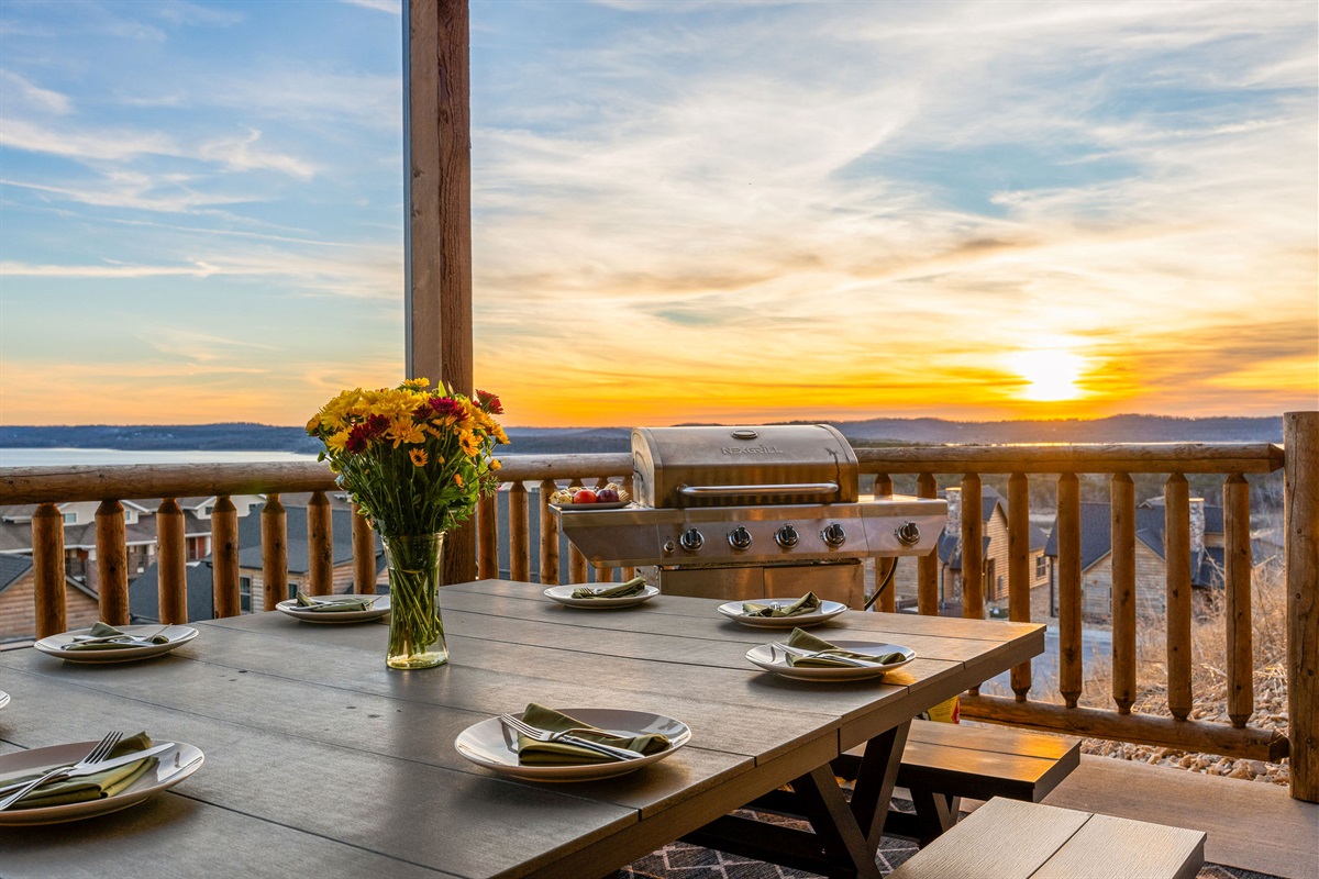 • Patio, Dining Table, Sectional Seating, BBQ Grill, Pergola over Private Hot Tub with Lighting and Lake View