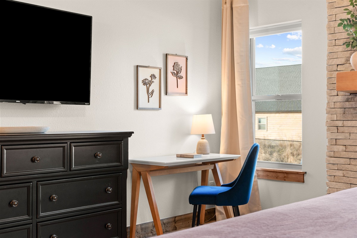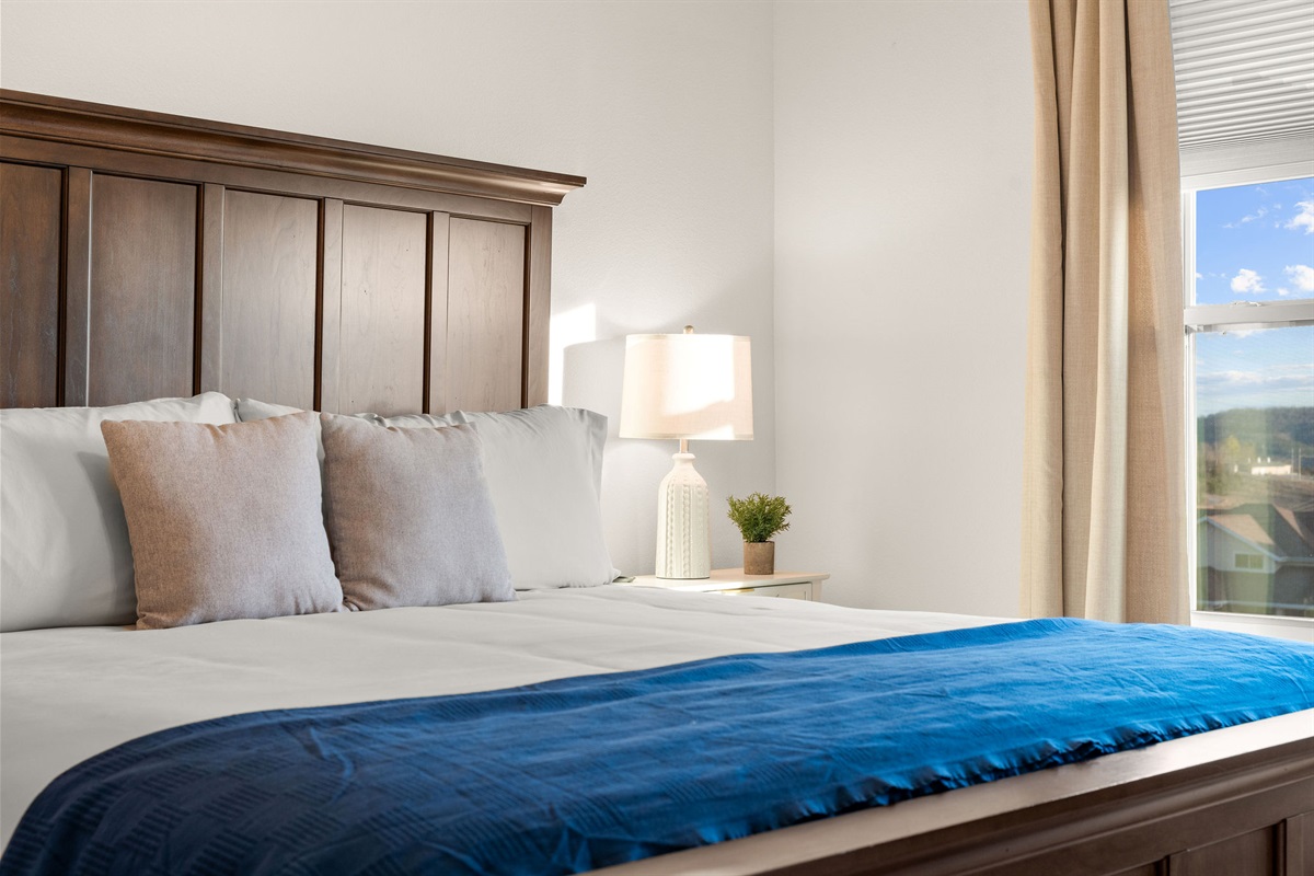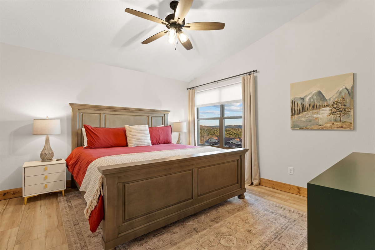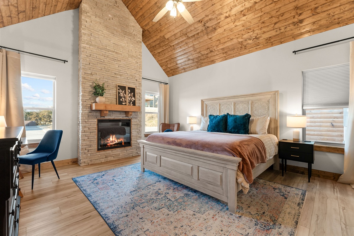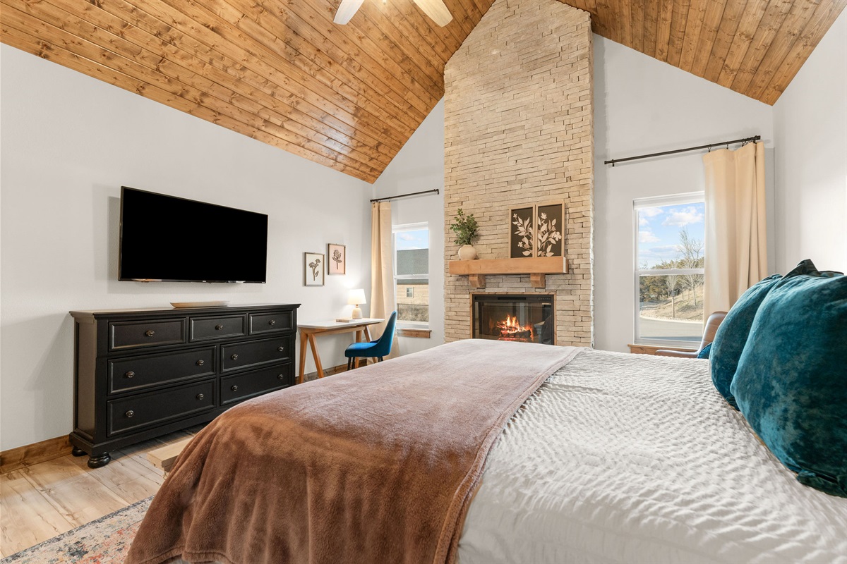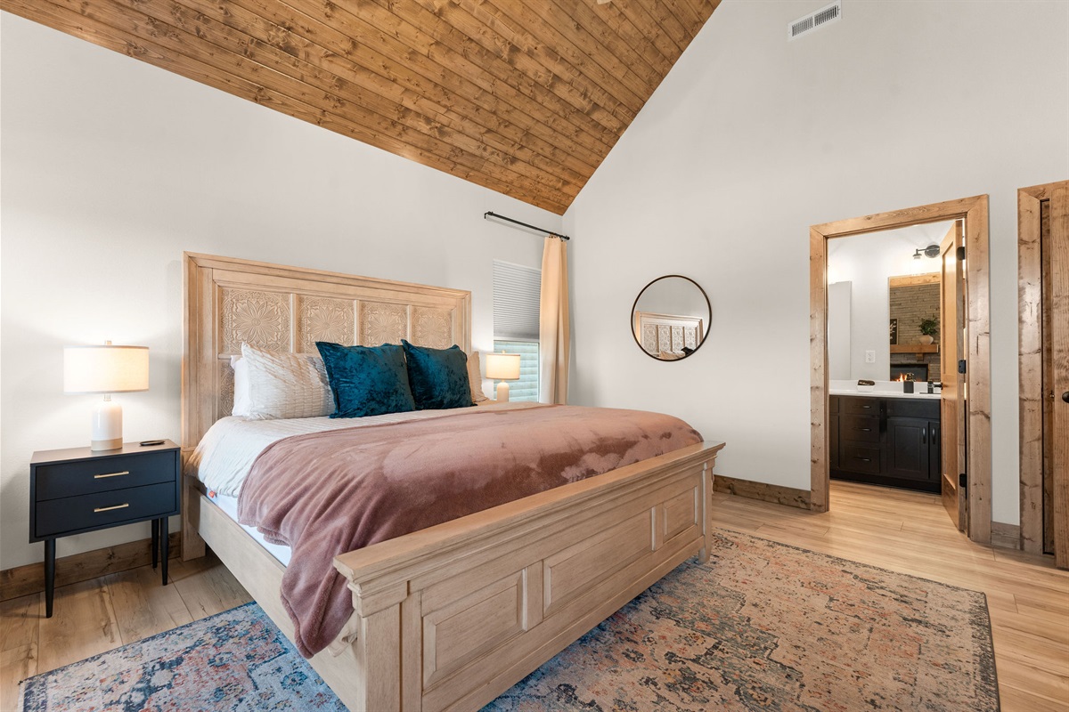• Bedroom 1: King Bedroom with Ensuite Bathroom, w/ Fireplace, Vaulted wood Ceilings