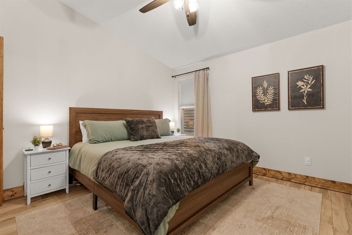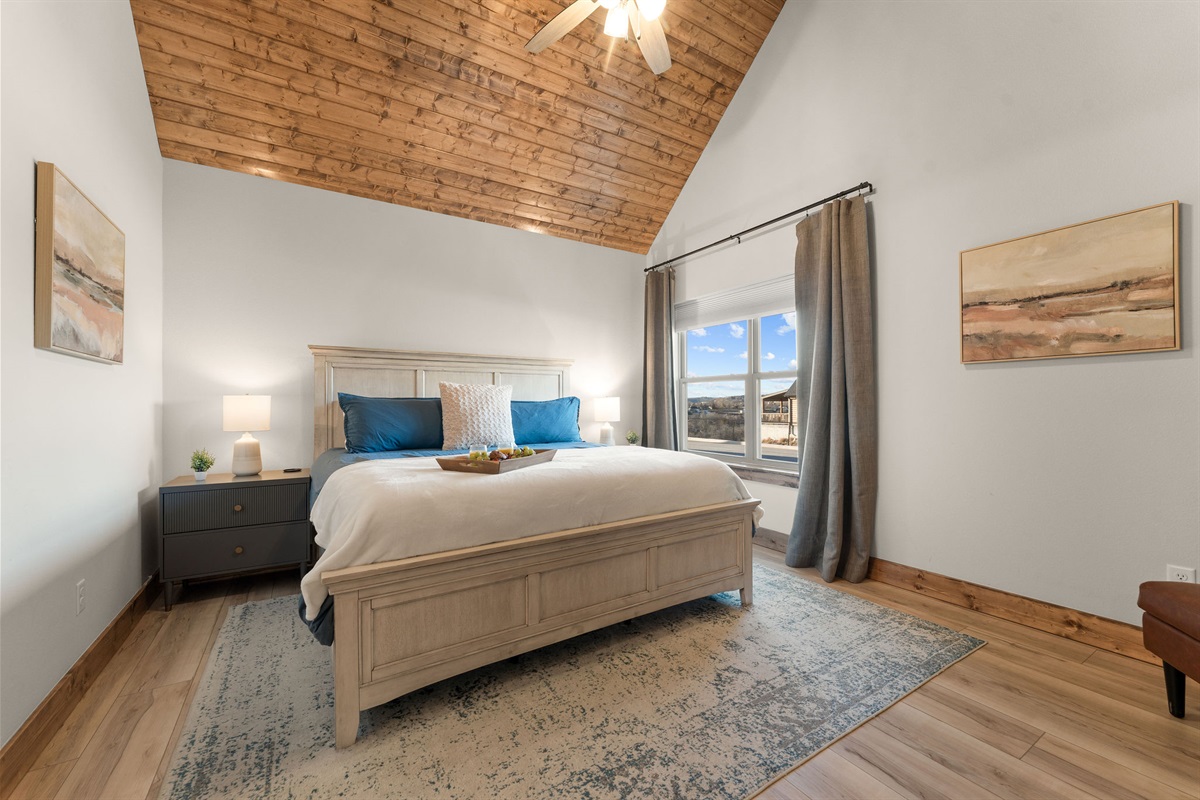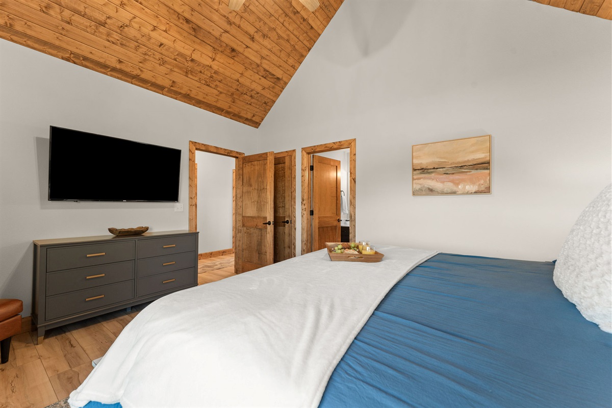• Bedroom 2: King Bedroom with Ensuite Bathroom, vaulted wood ceilings