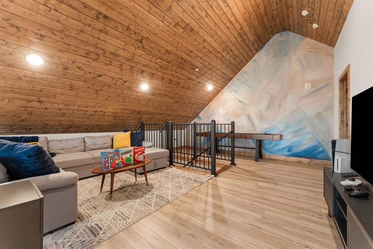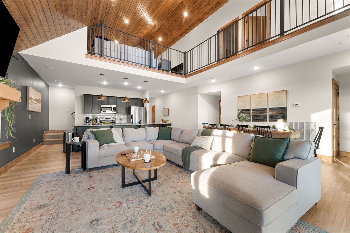 • Living room with Fireplace & Vaulted Wood Ceilings