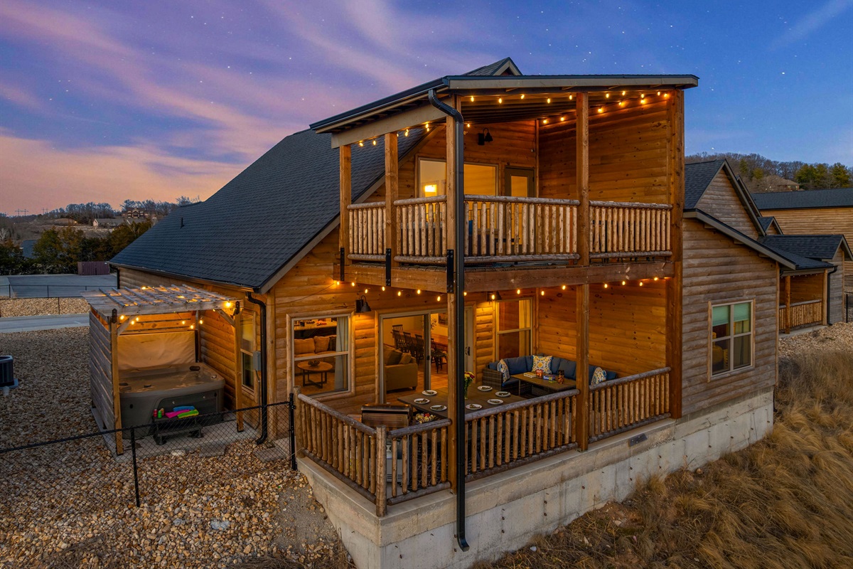 This charming Cabin accommodates up to 8 guests, perfect for memorable gatherings. Enjoy the panoramic lake view, inviting wood ceilings, and Private Hot Tub underneath a lit-up pergola. Discover a spacious patio and BBQ grill for outdoor fun with plenty of seating. Plus, entertainment awaits in the loft with a PlayStation and Shuffleboard. Additionally, the Development has 2 outdoor pools, an indoor pool, a Pickleball Court, a Lake kids' play area, and a Walking trail, and it is just minutes to Branson and SDC!