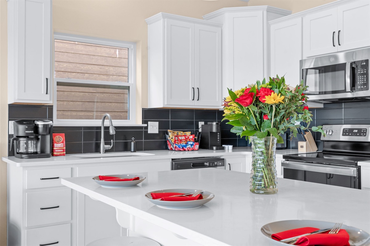 ✔ Fully stocked kitchen | Refrigerator | Stove & oven | Microwave | Dishwasher | Coffee maker | Toaster | Ice maker | Spices/pantry items | Baking sheets | Kitchen Island | Dining table | Barbecue utensils | Wine glasses